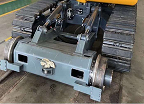 安裝鐵路導(dǎo)向輪,履帶板采用橡膠板,能實現(xiàn)在鐵路線路上自由上下道,并確保在鋼軌上行走而不會損傷鋼軌。